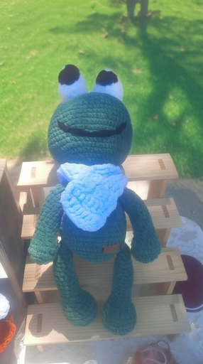 Bu əl işi tikilmiş oyuncaq, yaşıl rəngli gövdəsi və böyük ağ gözləri ilə diqqət çəkir. Mavi şəkli ilə zəriflik katarak hazırlanmışdır və yumşaq ipdən hazırlanmışdır. Açiq havada dekorasiya üçün uyğun olan bu oyuncaq, uşaqlar və hədiyyələr üçün idealdır.