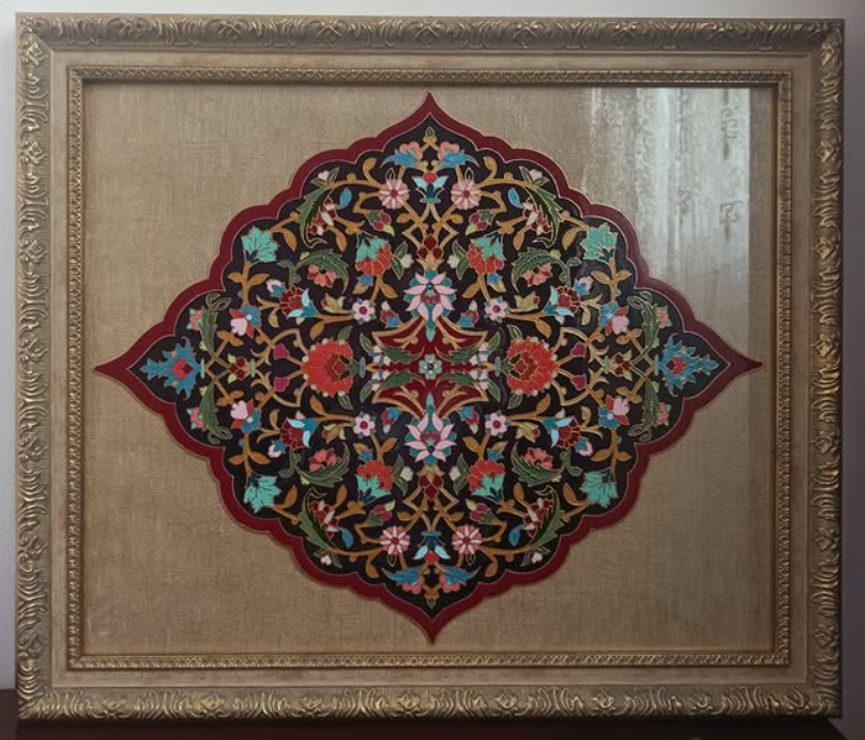 Bu əsər gözəl bir incəsənət nümunəsidir və çərçivə içində təqdim olunmuşdur. Mərkəzi hissəsi qara fon üzərində rəngli çiçək və bitki motifləri ilə bəzədilib. Qırmızı və yaşıl kənarlıqlar ilə əhatə olunmuş diamant şəkili, incə və simmetrik dizaynı ilə diqqət çəkir. Çeşitli rənglərdə (qırmızı, mavi, çəhrayı, yaşıl və s.) çiçək və yapraqlar əsərə canlılıq verir. Fonun nöqtəli teksturası və zərif çərçivəsi əsərə klassik və ənənəvi bir cazibə əlavə edir. Bu, şərq mədəniyyətindən ilham alınmış bir dekorativ sənət əsəri kimi təqdim oluna bilər.